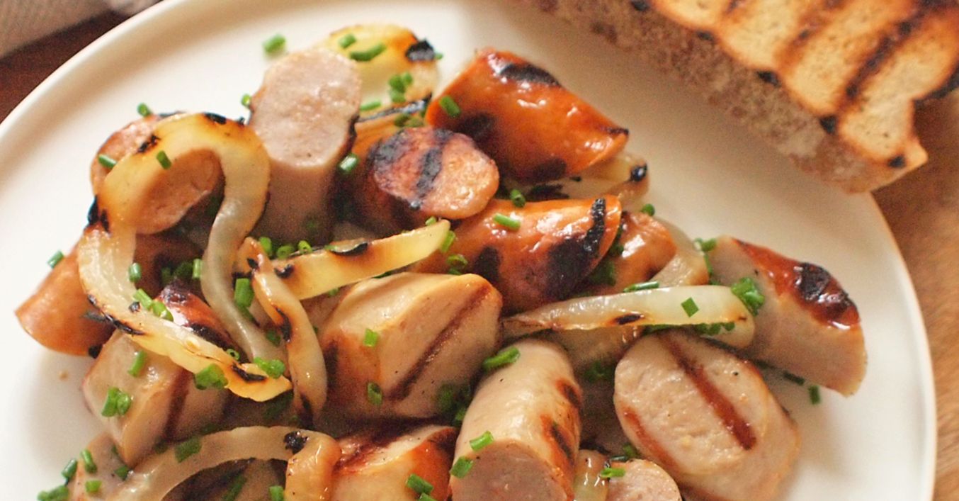 Grilované klobásky nakrájíme na kousky. Grilovanou cibuli rozdělíme na kolečka a v míse promícháme spolu s klobáskami a pažitkou.