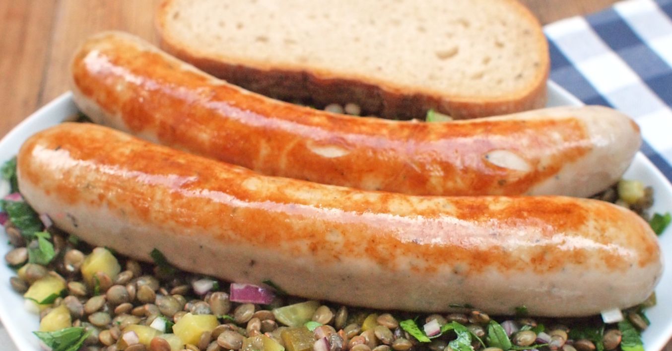Klobásky opečeme na rozehřátém másle z obou stran (dohromady asi 8 až 10 minut) a podáváme spolu s čočkovým salátem.