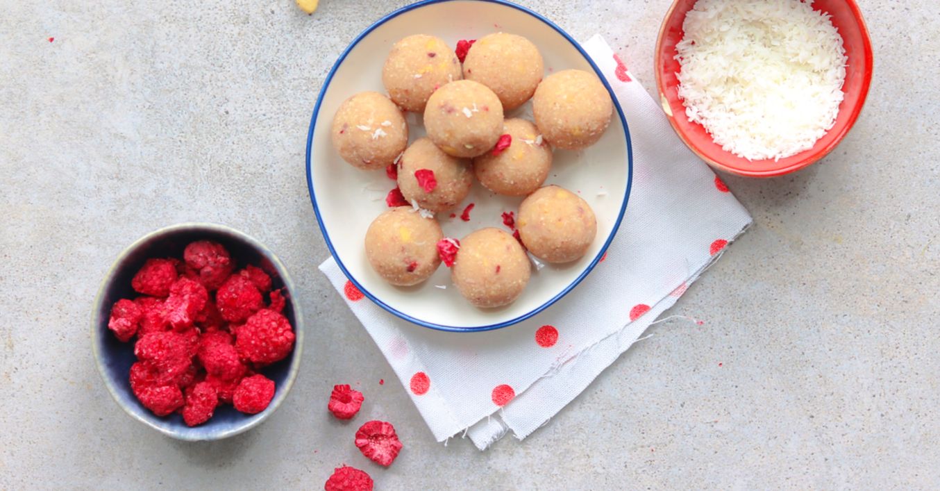 Kokosové kuličky s kešu a lyofilizovanými malinami