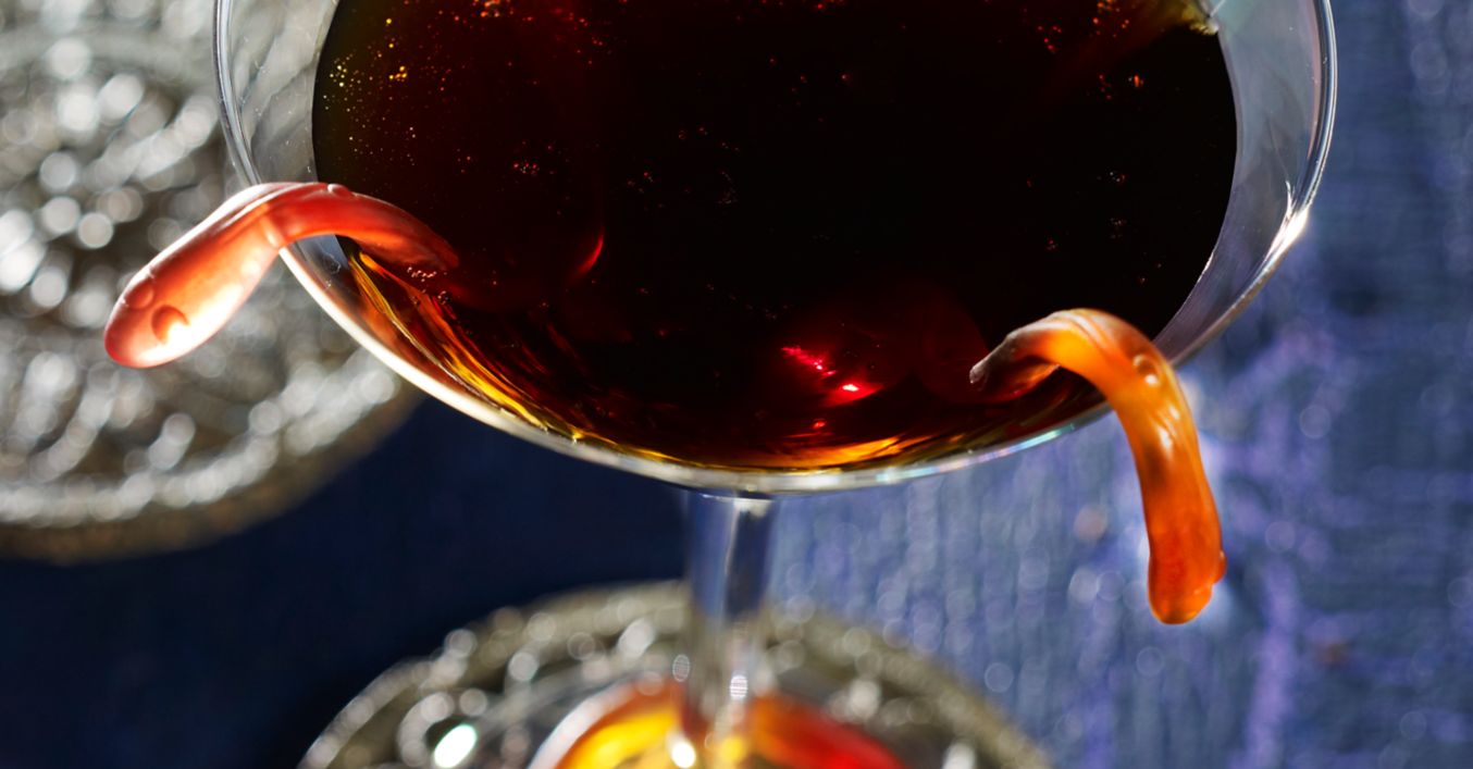 Podáváme do martini skleniček a zdobíme gumovými žížalkami.