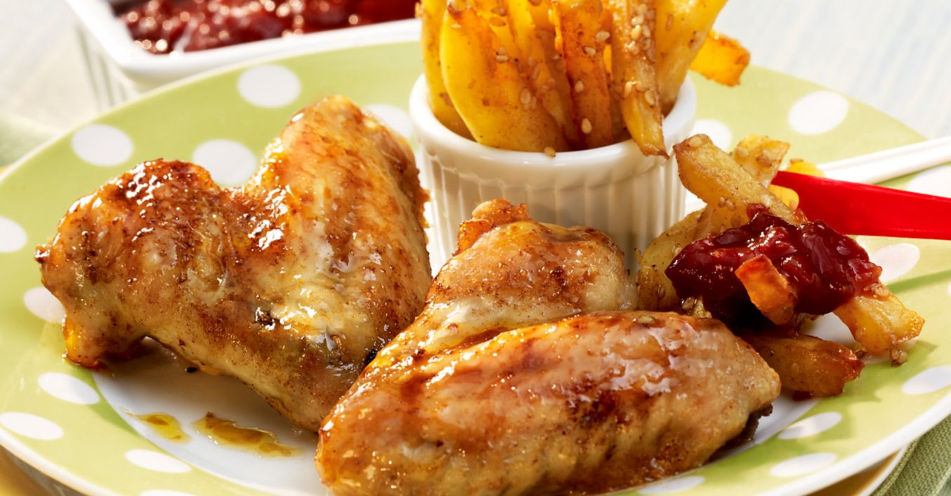 Upečená křídla a hranolky podáváme spolu s omáčkou.