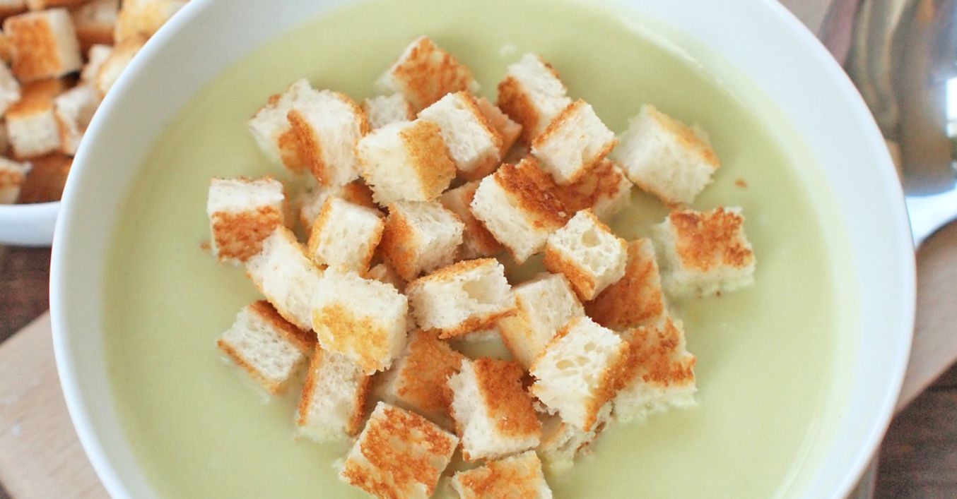 Když je hrách měkký, odstraníme balíček, vylovíme cibuli a odstavíme. Vmícháme smetanu, rozmixujeme a dochutíme solí. Podáváme spolu s krutony.