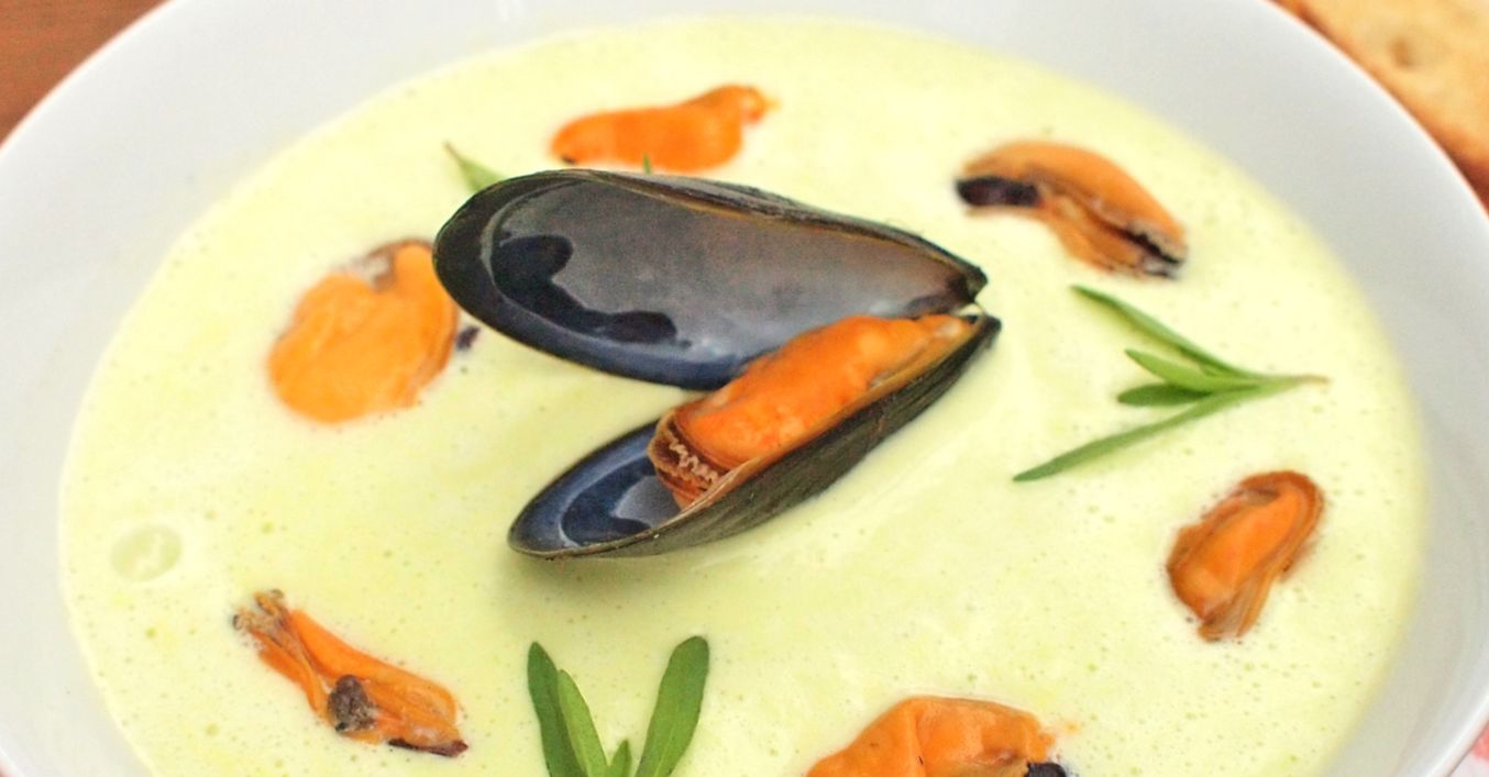 Zalijeme vývarem a zbylou tekutinou ze slávek. Na středním plameni povaříme asi 10 až 15 minut. Vmícháme smetanu, přidáme estragon a rozmixujeme tyčovým mixérem. Dochutíme solí a pepřem. Přidáme slávky, necháme společně prohřát a ihned podáváme.