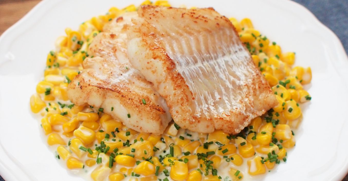 Do krémové kukuřice vmícháme pažitku a podáváme spolu s treskou.