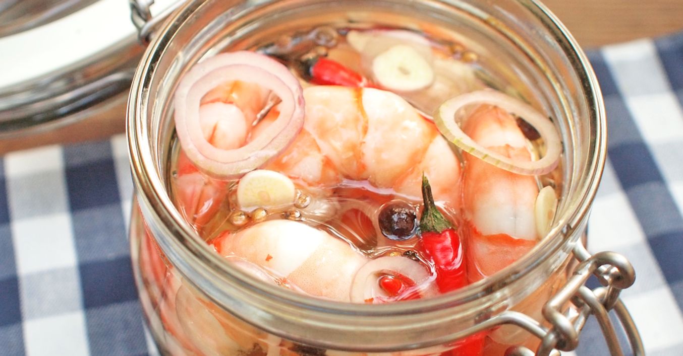 Připravíme si čistou sklenici, do které po těsných vrstvách skládáme krevety, koření, chilli papričku, šalotku a česnek. Vše zastříkneme šťávou z limetky a zalijeme olivovým olejem.