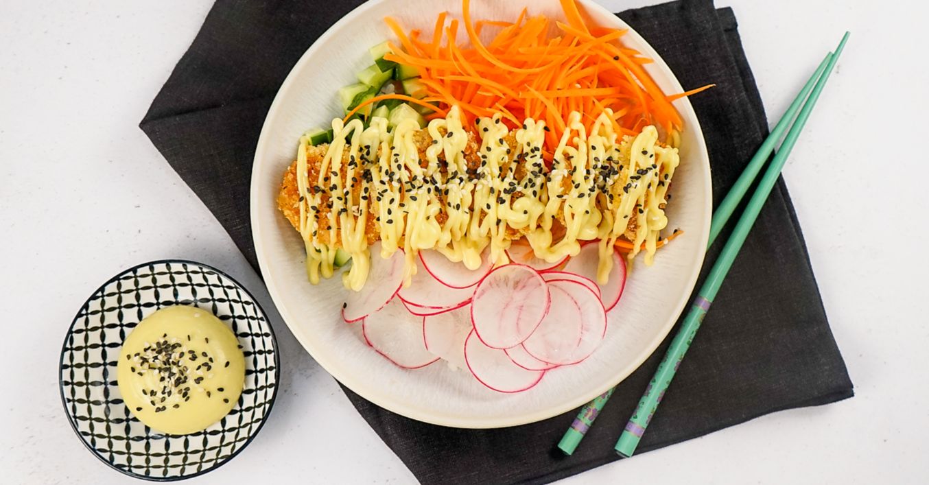 Do misky nasypte uvařenou rýži, přelijte lžící omáčky, přidejte zeleninu a krevety. Nakonec vše zalijte wasabi majonézou a posypte sezamovými semínky.