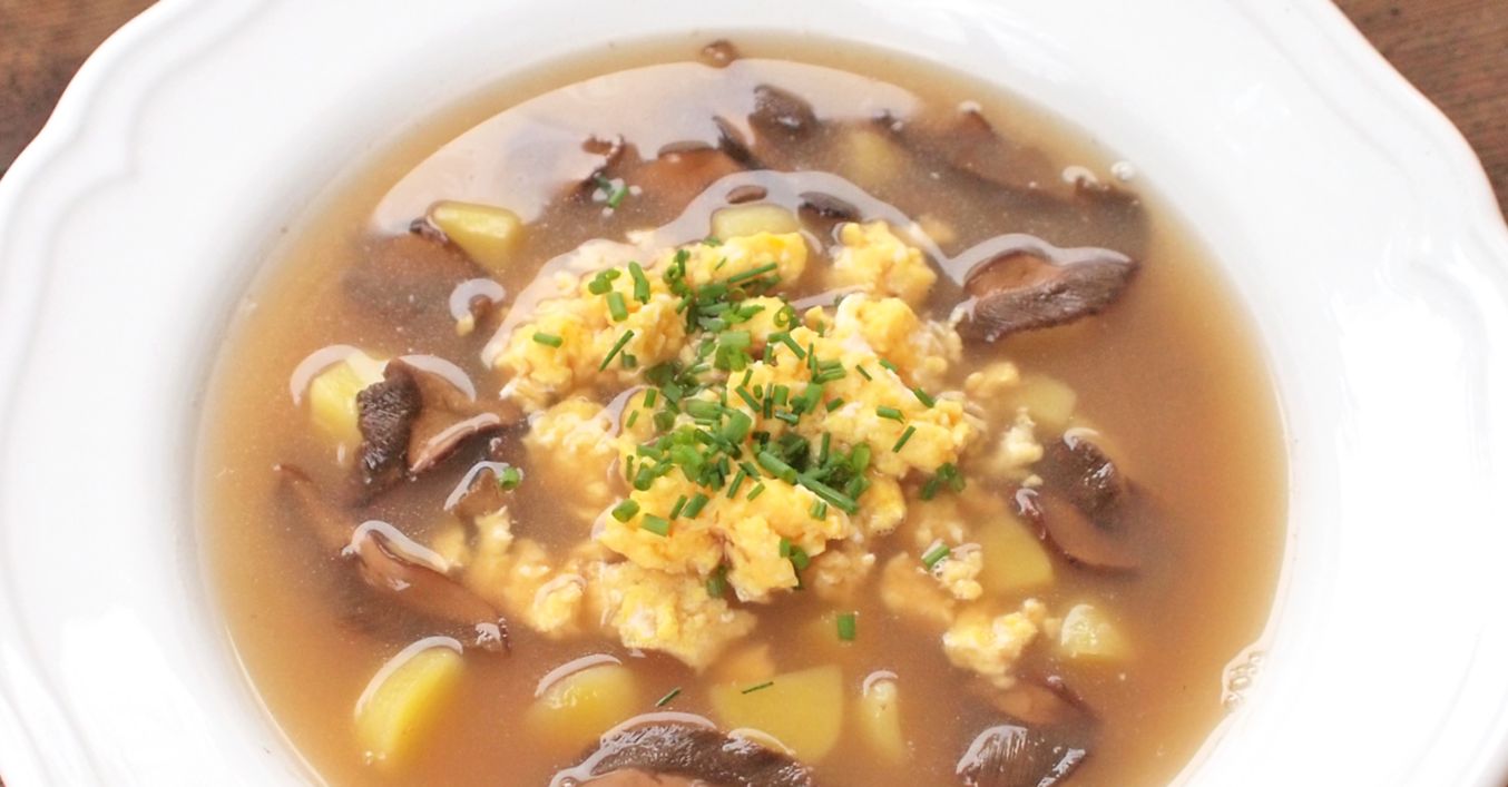 Před podáváním si připravíme i míchaná vajíčka, která podáváme přímo do talíře ke kyselu. Zdobíme nadrobno nasekanou pažitkou.