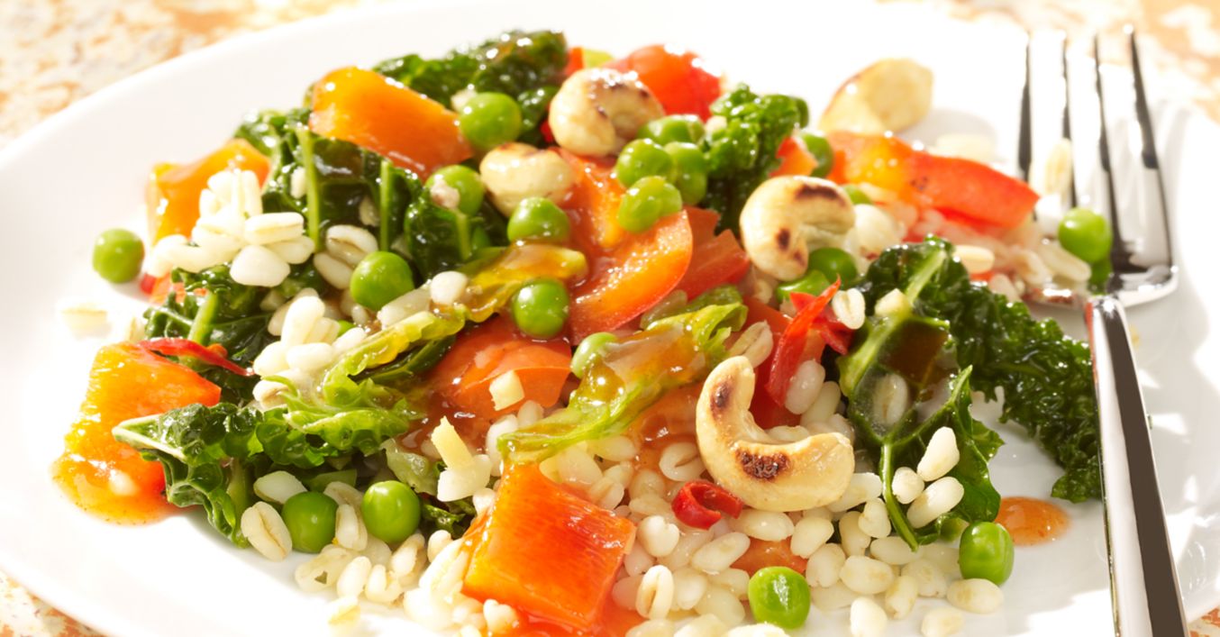 V rozpáleném oleji pak zprudka a krátce osmahneme chilli papričku, papriku a zázvor. Pak přidáme kapustu, osolíme, opepříme, necháme zavadnout a zalijeme vývarem. Dusíme asi 5 až 10 minut a na konci přidáme i hrášek, který jen lehce prohřejeme. Podáváme s kroupami.