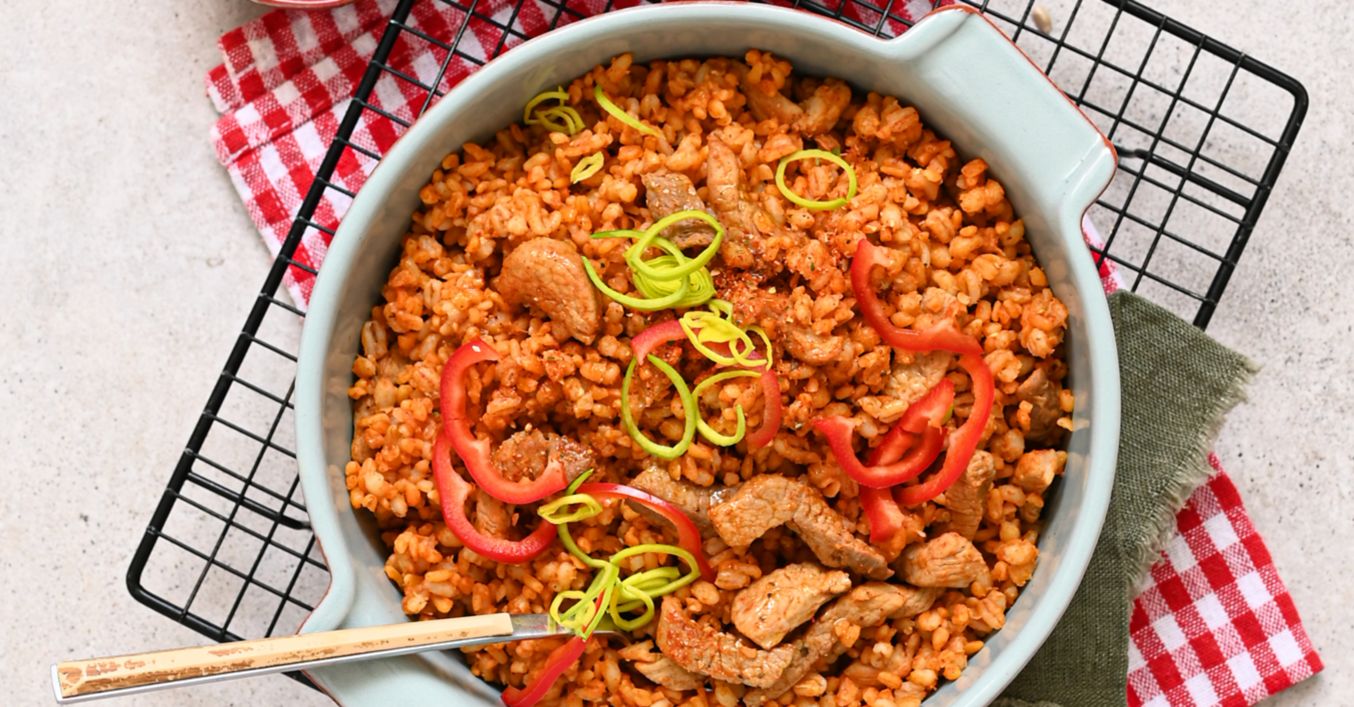 Kroupové rizoto s paprikou a vepřovými nudličkami
