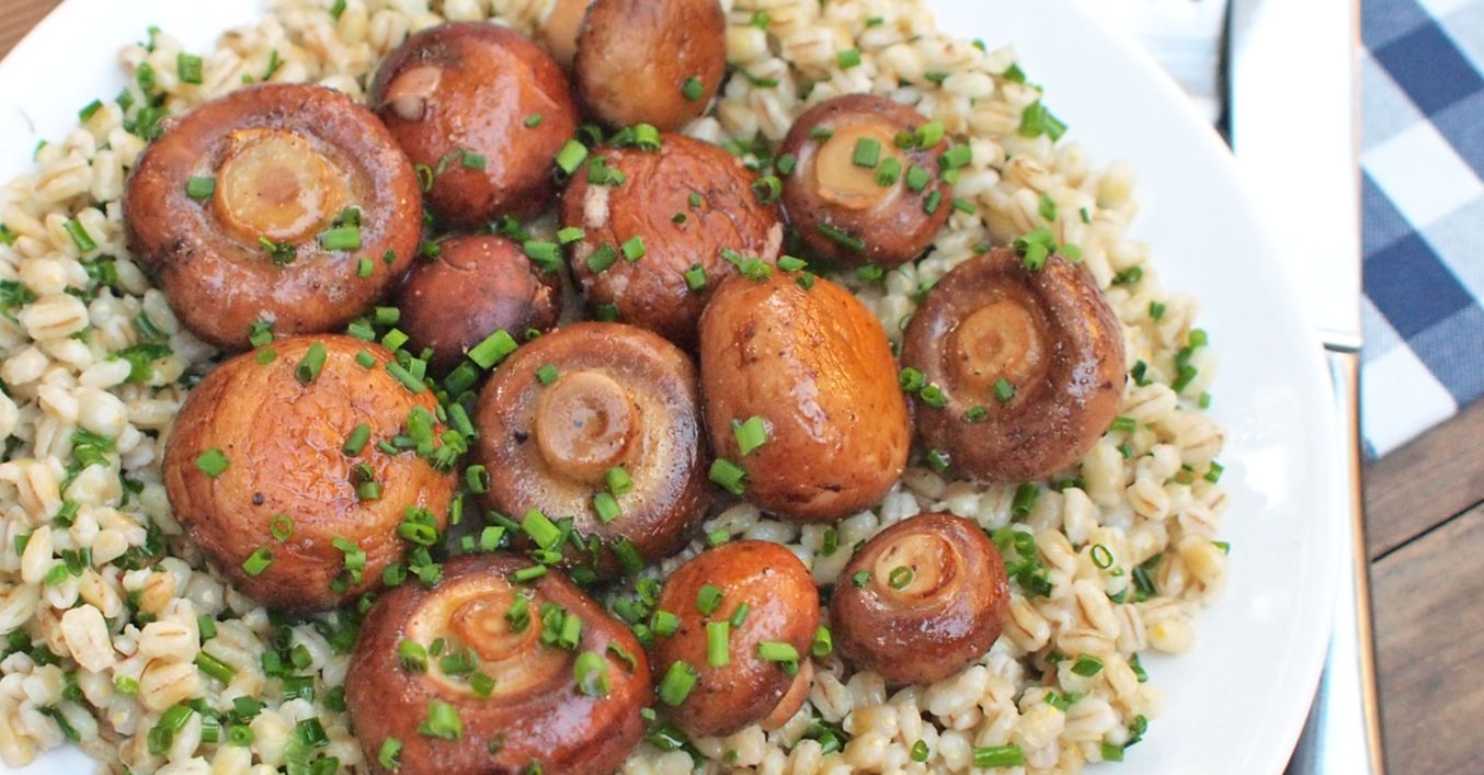 Kroupy vmícháme do pekáče se žampiony. Tymián odstraníme a vmícháme nasekanou pažitku.