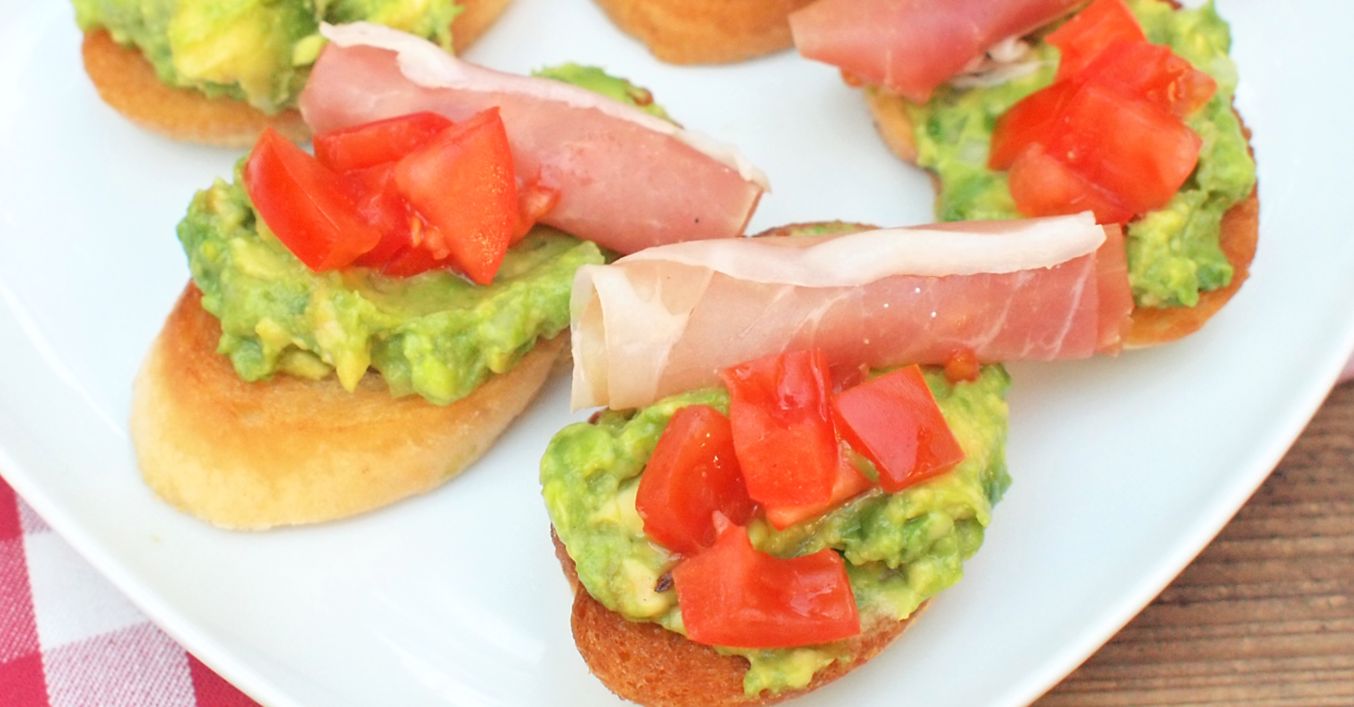 Na každou topinku nandáme trochu avokáda, přidáme rajčata a ozdobíme kouskem sušené šunky.