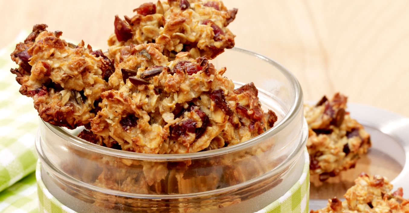 V míse smícháme jogurt, podmáslí, med, cukr a vejce. Přidáme ovesné vločky, mouku, prášek do pečiva a dobře zapracujeme. Brusinky a semínka nasekáme nožem a také přidáme do těsta.