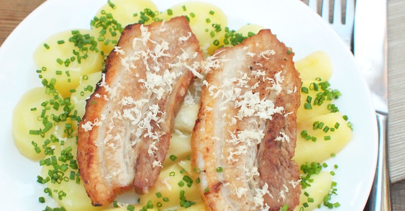 Vychlazený bůček nakrájíme na tenké plátky (asi 1 cm), které zprudka opečeme na nepřilnavé pánvi dozlatova. Plátky bůčku podáváme s dušenými jablky.