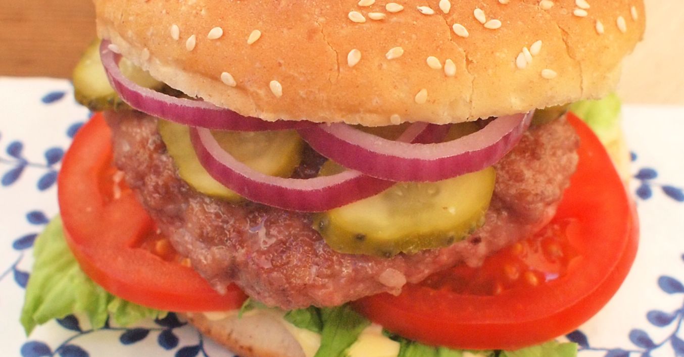 Housky potřeme majonézou, přidáme salát, rajče, grilovaný burger, okurku a cibuli.