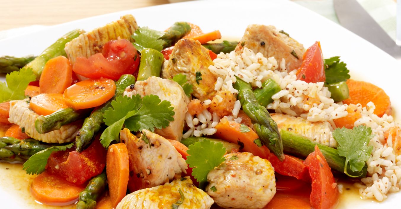 Mrkev oloupeme a nakrájíme na tenké plátky. Z chřestu odkrojíme konce, oloupeme spodní třetinu a nakrájíme na čtvrtiny. Rajčata umyjeme, zbavíme stopky i jadérek a nakrájíme na větší kostky. Krůtí maso osušíme, nakrájíme na kostky a dochutíme solí a pepřem.