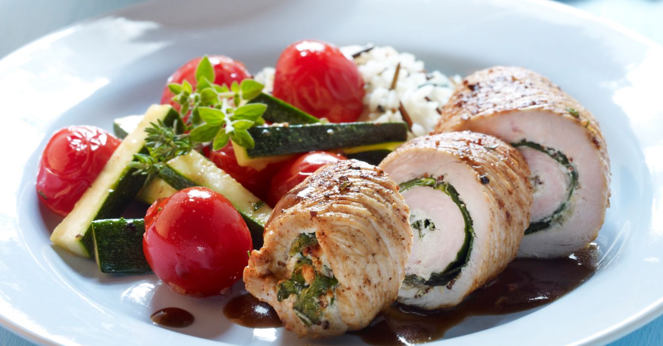 Cukety očistíme a nakrájíme na širší hranolky. Cibuli i česnek oloupeme. Cibuli nakrájíme nadrobno a česnek podrtíme. V hrnci rozehřejeme olivový olej a necháme na něm zesklovatět cibuli a česnek. Přidáme cuketu, krátce zasmahneme a přidáme rajčata. Dochutíme solí, cukrem, pepřem a bylinkami. Dusíme jen chvíli, dokud rajčata nepustí trochu šťávu. Poté podáváme s hotovými závitky.
