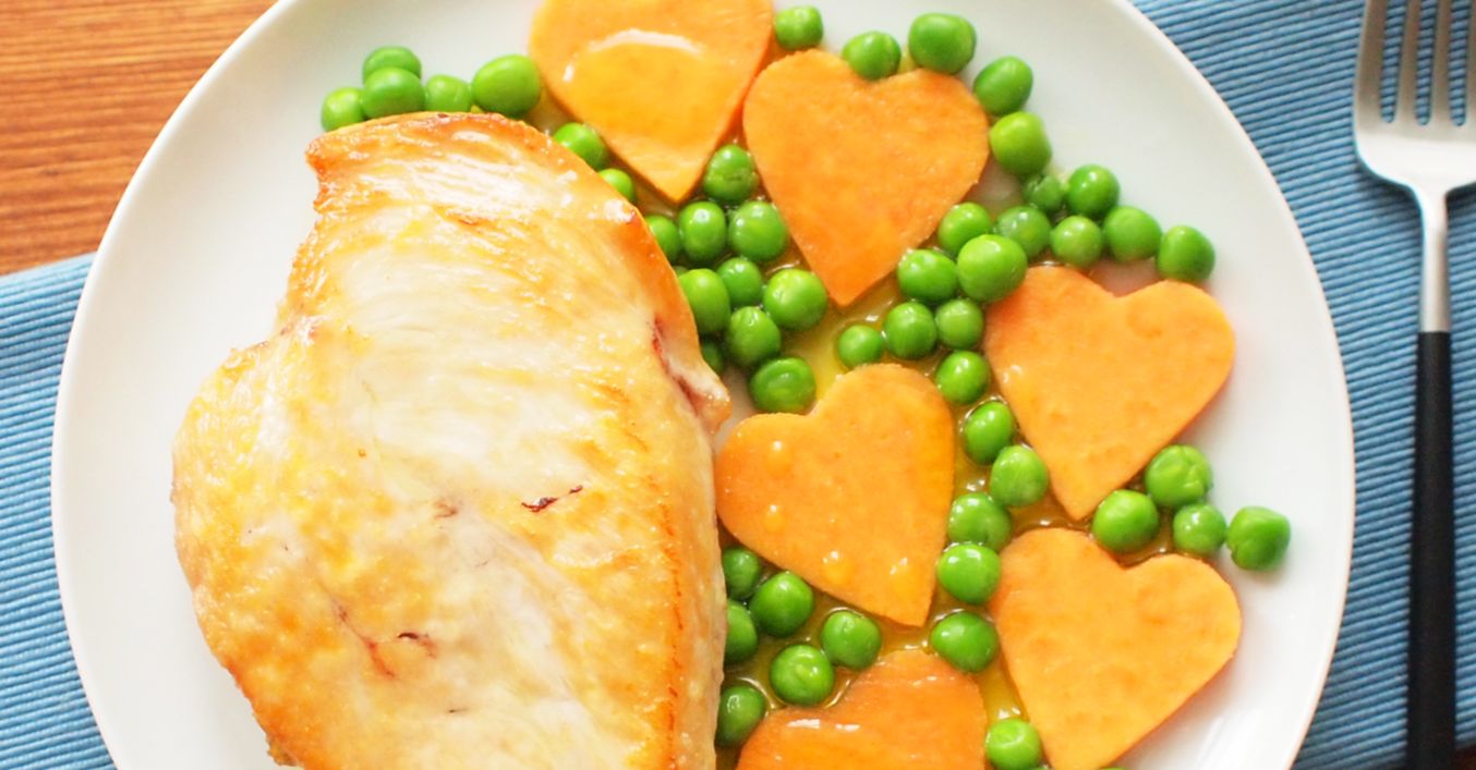 Kuře s dušeným hráškem a batátovými srdíčky