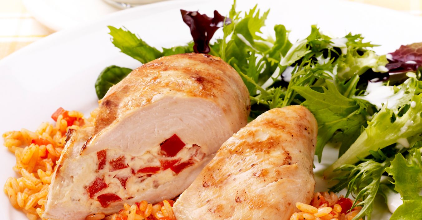 Kuřecí prsa očistíme, osušíme a do každého vyřízneme podélnou kapsu. Papriku očistíme, zbavíme jadřince a nakrájíme na malé kostičky. Polovinu paprik promícháme s čerstvým sýrem a dochutíme solí a pepřem. Paprikovou náplní potom naplníme kuřecí řízky a otvor zajistíme špejlí. Rýži uvaříme podle návodu na obalu.