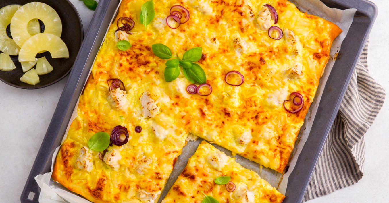 Ananas nakrájejte na kousky a spolu s kuřecím přidejte na pizzu. Navrch rozprostřete sýr a pečte v troubě asi 25 minut.
