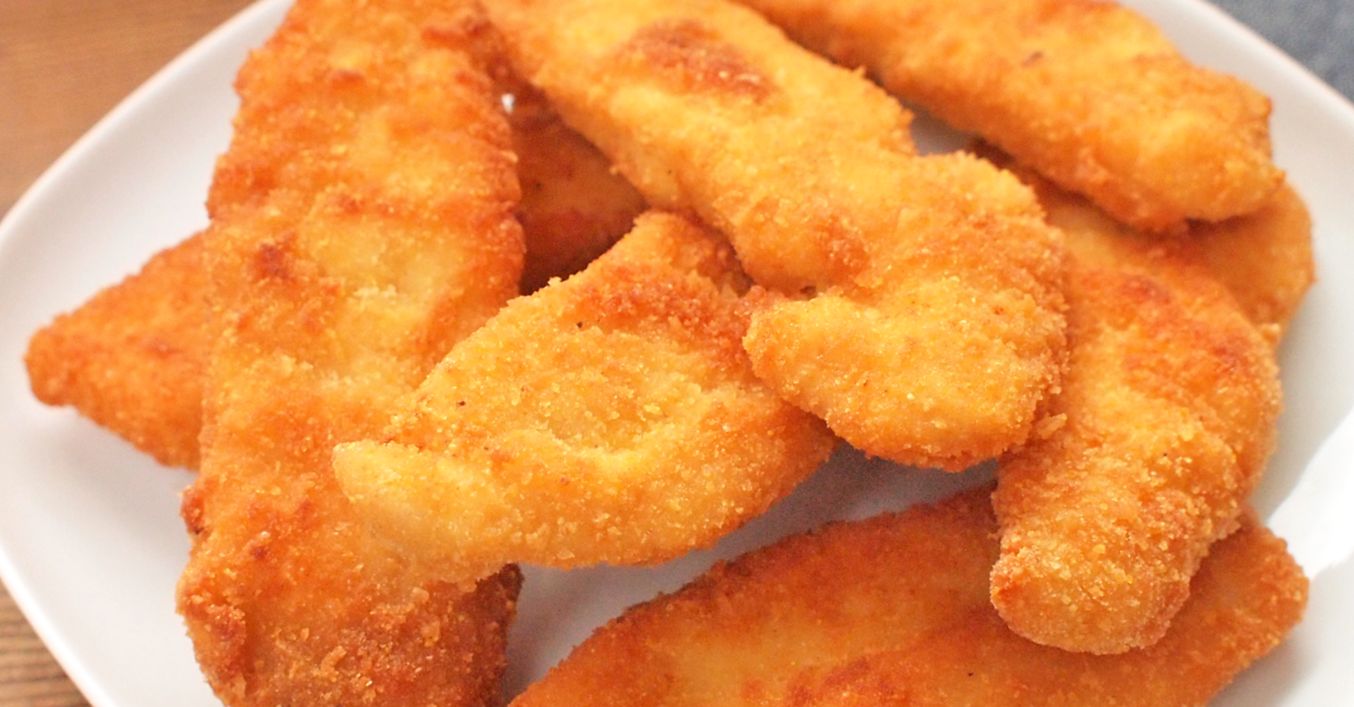 Kuřecí prsa očistíme a osušíme. Příčně je nakrájíme na několik silnějších proužků, které rozložíme na pracovní desku a přeložíme fólií. Naklepeme a osolíme.