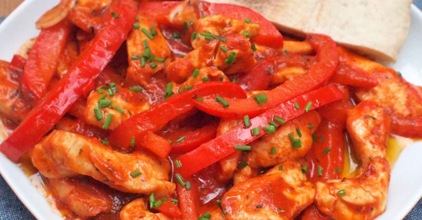 Vložíme zpět kuřecí maso, přidáme protlak a krátce podusíme. Na konci vmícháme čerstvé bylinky a podáváme.