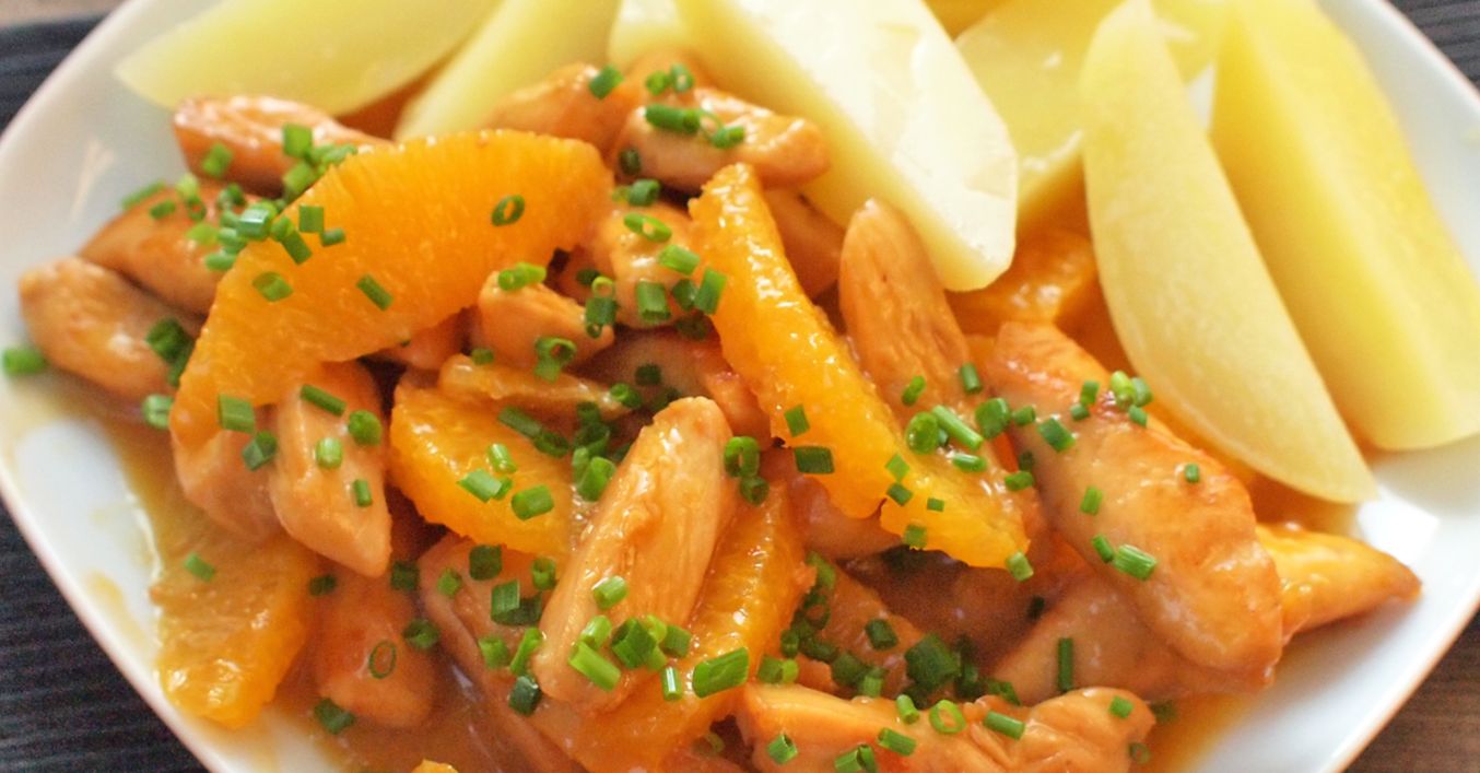 Kuřecí prsa očistíme, osušíme a nakrájíme na nudličky, které dochutíme solí a pepřem. Pomeranč oloupeme nožem a vyfiletujeme na dílky čisté dužiny. Šalotku oloupeme a nasekáme nadrobno.