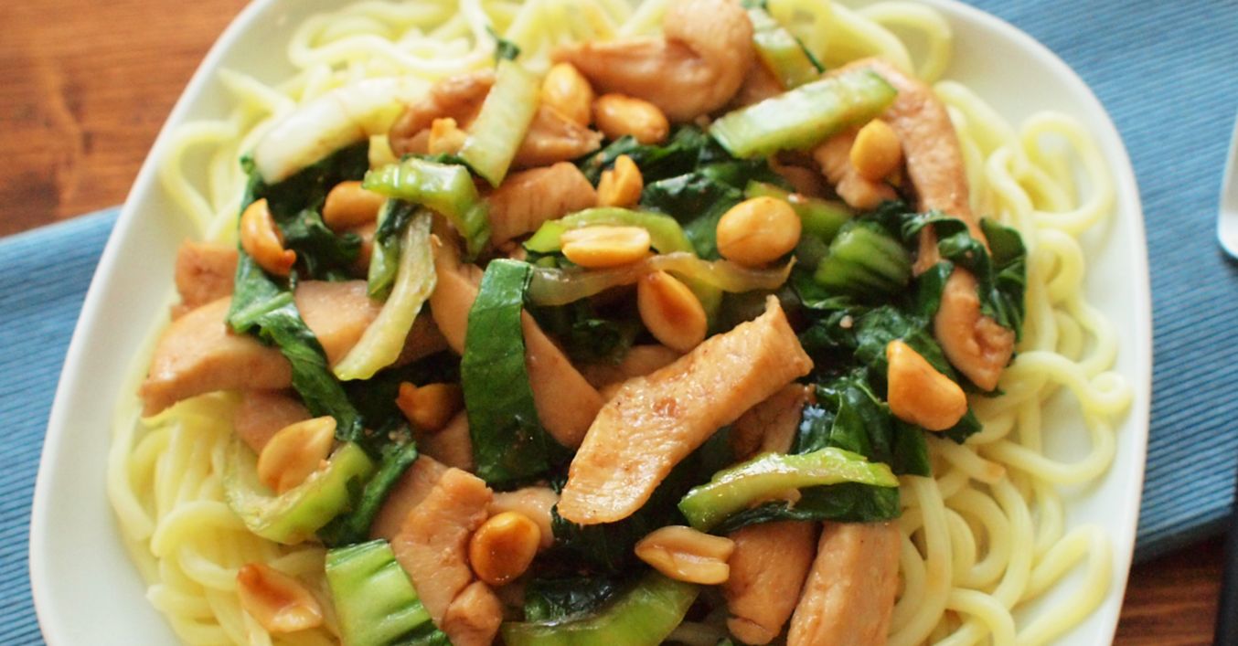V pánvi rozehřejeme olej, přidáme kuřecí nudličky a zprudka orestujeme dozlatova. Vmícháme šalotku s česnekem a dále restujeme. Vmícháme sójovou omáčku, arašídy, přidáme pak choi a společně promícháme (dohromady asi 8 až 10 minut).