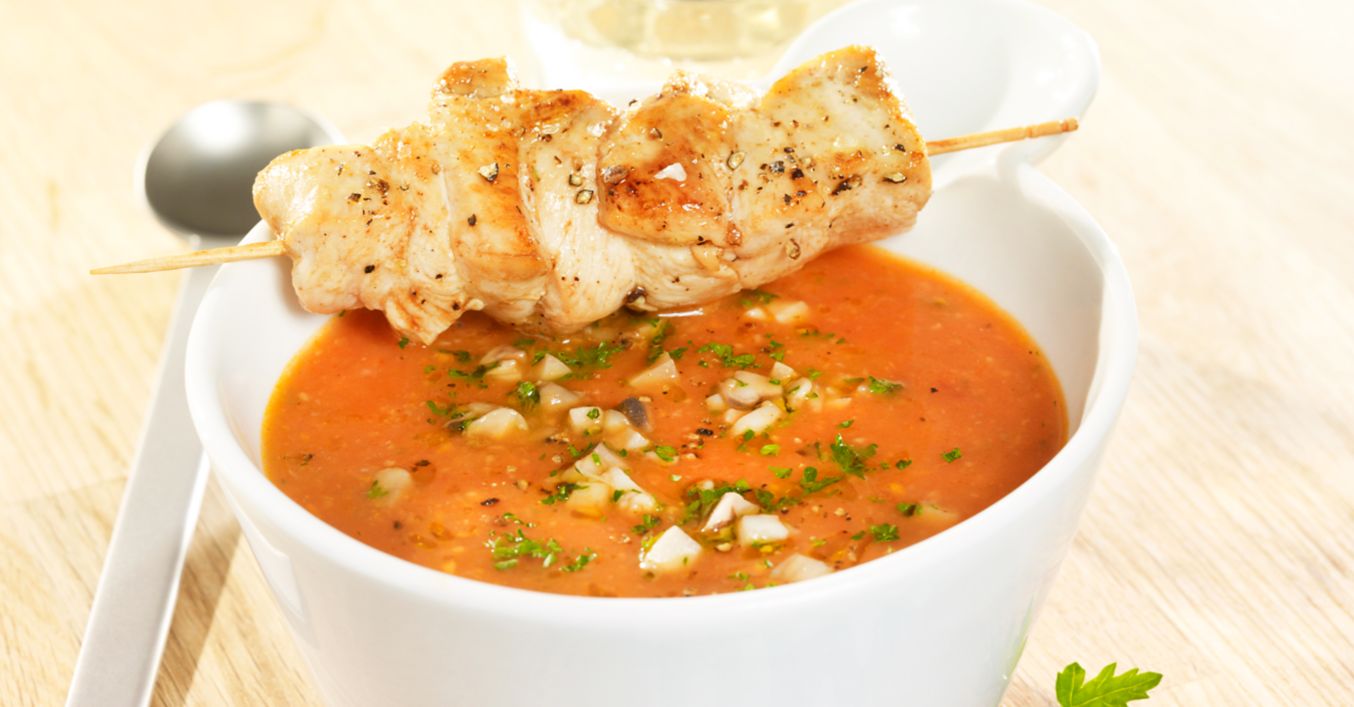 Hotovou polévku rozmixujeme a podle potřeby ještě vyladíme dochucení. Podáváme s hotovými kuřecími špízy.