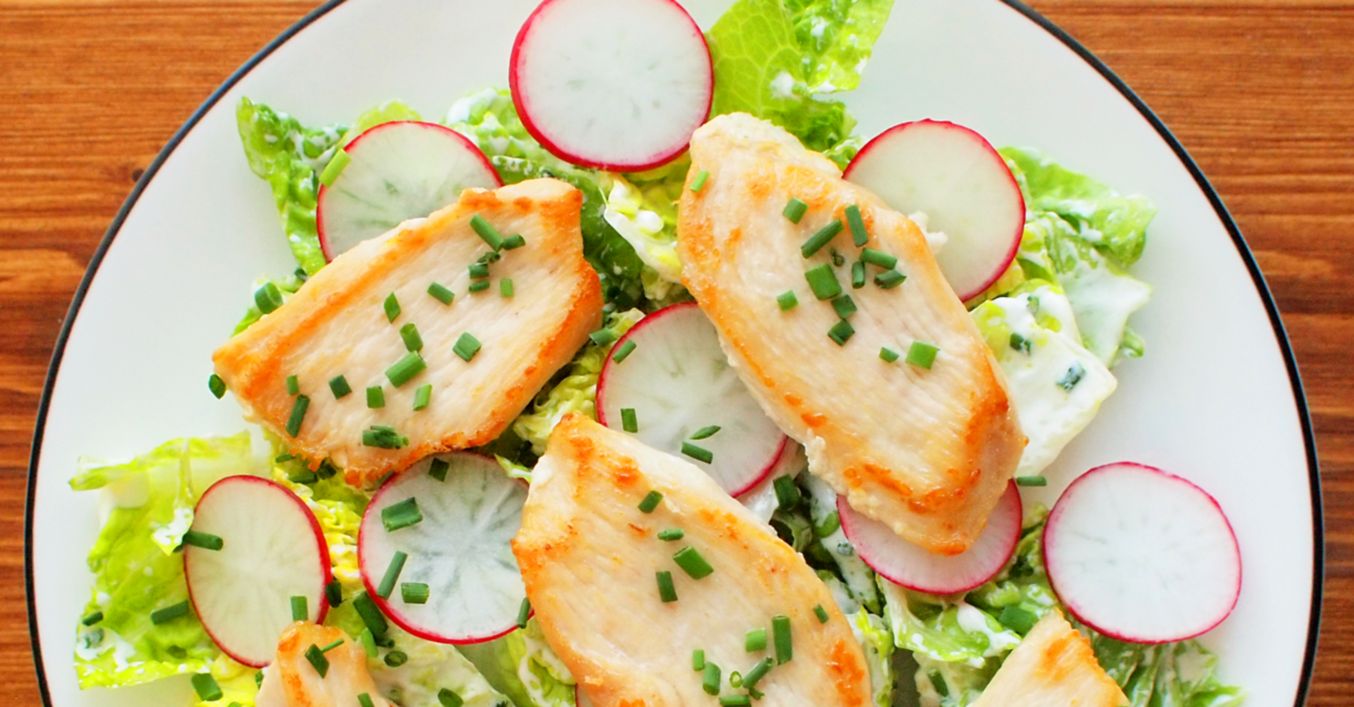 Salát rozdělíme na listy, propereme a osušíme. Poté natrháme na sousta. Ředkvičky očistíme a nakrájíme na čtvrtiny. Zeleninu promícháme se zálivkou a servírujeme s kuřetem.