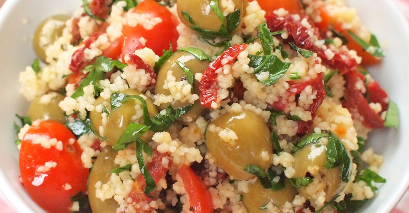 Do kuskusu vmícháme olivy, sušená rajčata, cherry rajčata, bazalku a olivový olej. Dochucujeme solí, pepřem, citronovou šťávou a špetkou citronové kůry.