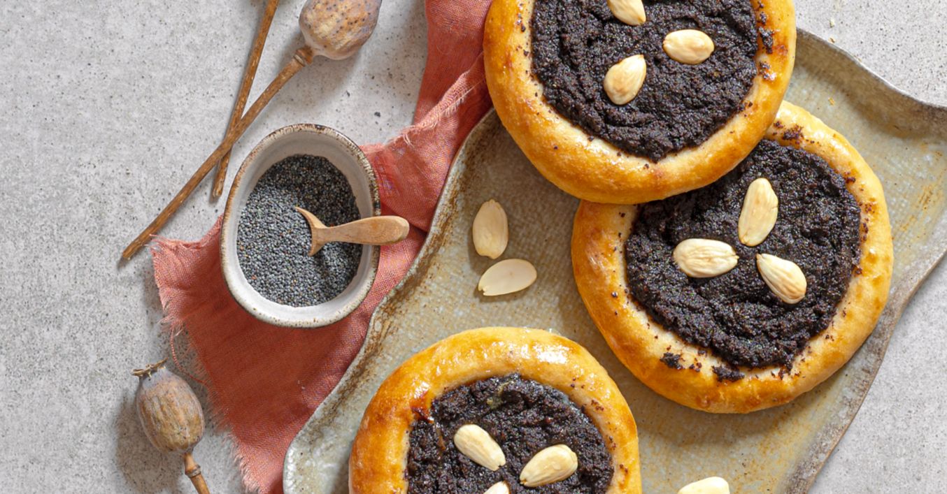 Do středu každé placičky rozetřete makovou náplň. Ozdobte mandlemi. Poté koláčky zakryjte utěrkou a nechte kynout dalších 30 minut.