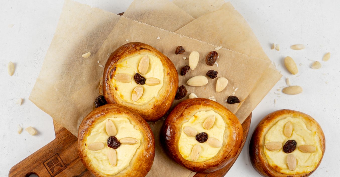 Do středu každé placičky rozetřete tvarohovou náplň. Ozdobte rozinkami a mandlemi. Poté koláčky zakryjte utěrkou a nechte kynout dalších 30 minut.