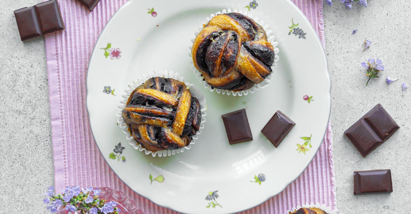 Těsto rozválejte na obdélník silný cca 1 cm a rovnoměrně ho potřete čokoládovou náplní. Pak nakrájejte na proužky silné cca 1,5 cm. Každý pruh zamotejte do spirálky, poté kolem prstu dokola. Konec zastrčte dospodu. Dejte do papírových košíčků a nechte 30 minut kynout.