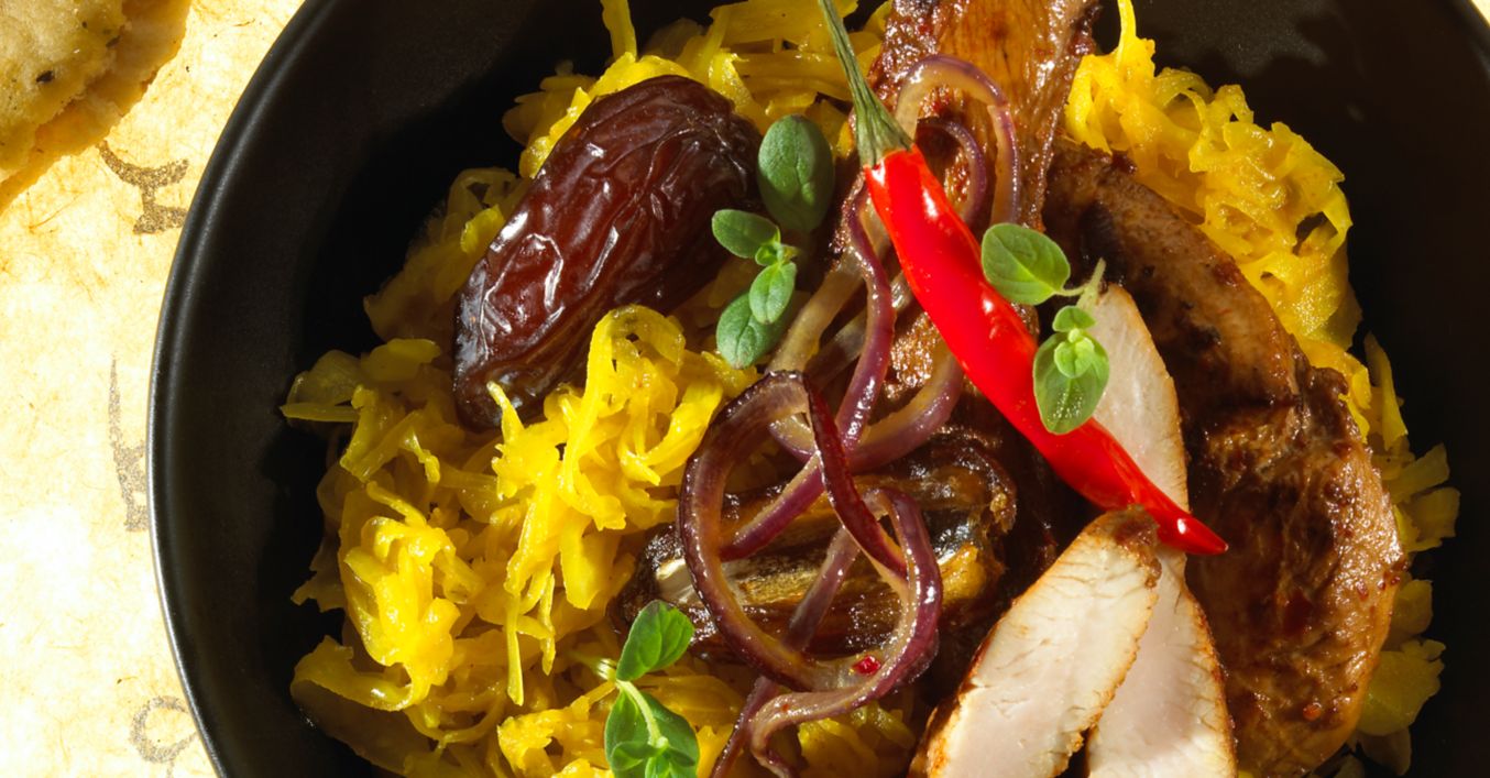Maso zalijeme vývarem a zbylou sójovou omáčkou. Promícháme a přidáme nasekané datle a zelí. Krátce podusíme a na konci ochutnáme. Podle potřeby ještě dochutíme solí a pepřem. Podáváme s grilovaným pita chlebem.