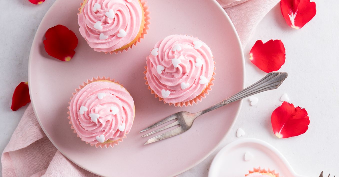 Muffiny nechte vychladnout na mřížce. Smetanový sýr, vanilkový cukr a moučkový cukr vymíchejte vidličkou do hladka a obarvěte potravinářským barvivem do růžovočervena. Krém dejte do sáčku a ozdobte jím muffiny. Ozdobte cukrovým zdobením a nápisem a podávejte.