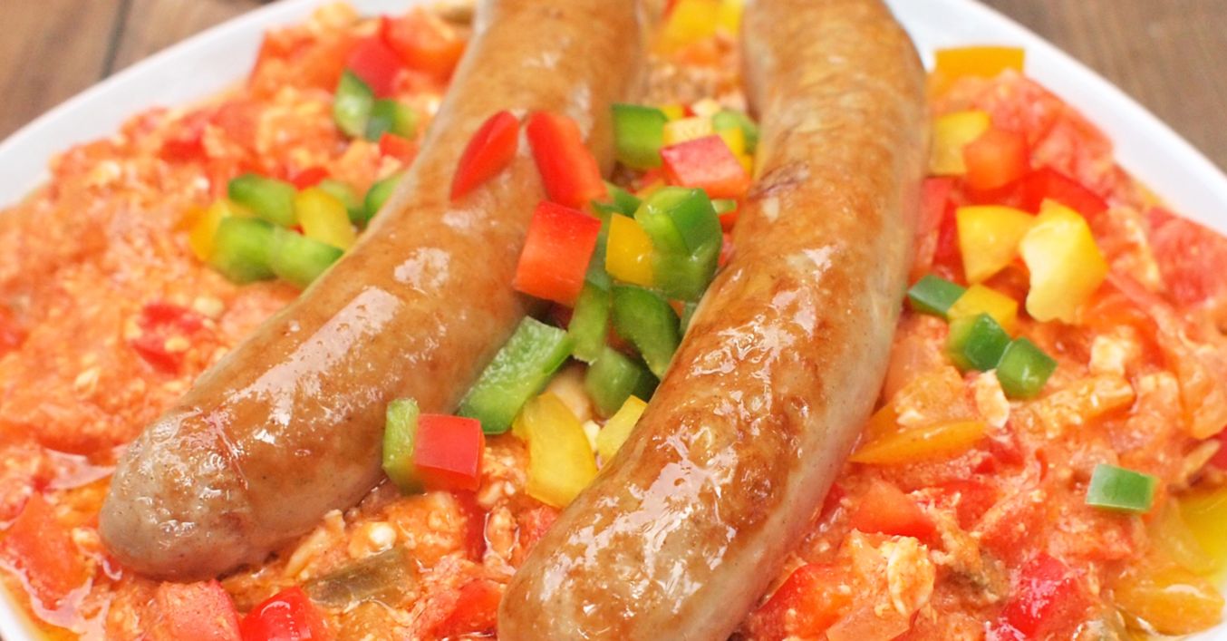 Přímo na zeleninu poté vyklepneme vejce, chvíli počkáme, než se zatáhnou bílky, a poté je rozmícháme. Podáváme spolu s upečenými klobáskami.