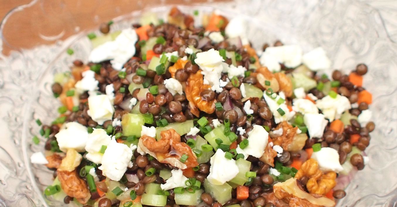 V míse smícháme čočku, zeleninu, nasekané bylinky, kozí sýr a vlašské ořechy. Promícháme a zalijeme zálivkou.