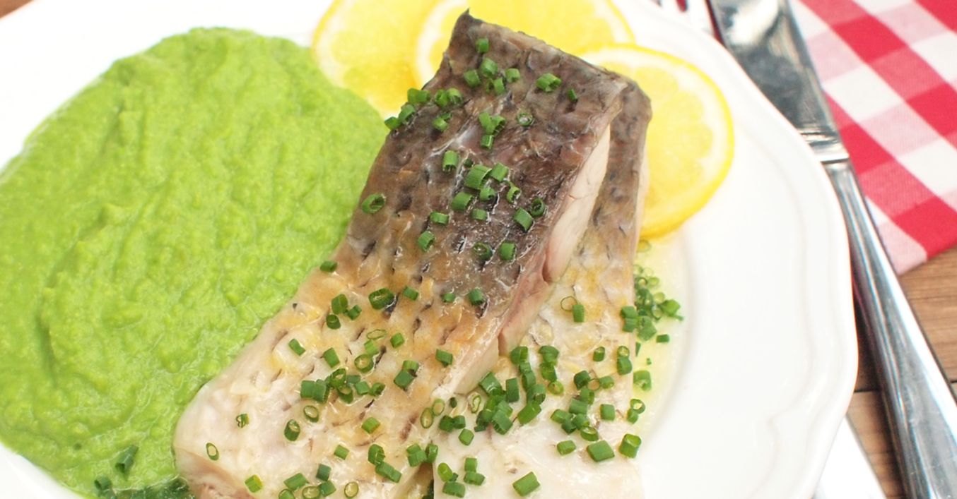 Uvařené díly kapra velmi opatrně vyjmeme, abychom je nerozlomili. Zbylé máslo rozpustíme a uvařené díly ryby s ním zakápneme. Servírujeme spolu s hráškovým pyré.