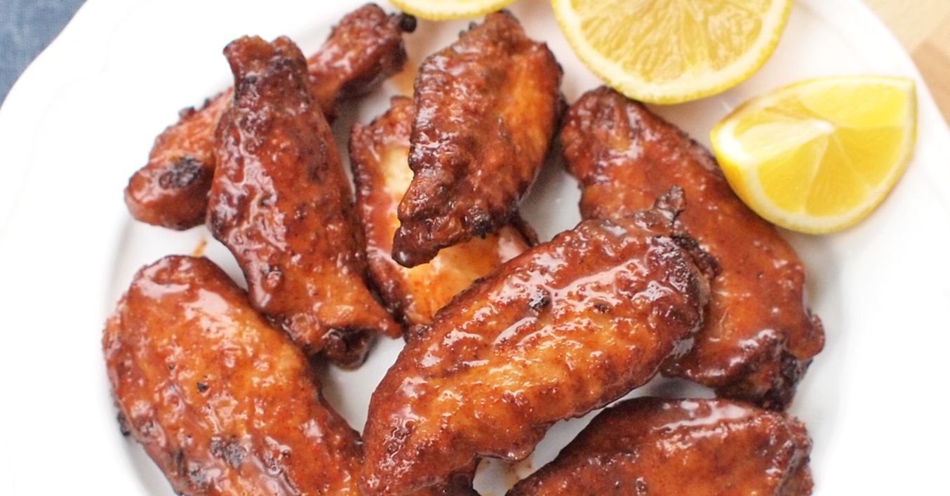 Maso přendáme do pekáčku nebo na plech vystlaný pečicím papírem. Přebytečnou marinádu přitom oklepeme. Pečeme v troubě rozehřáté na 200 °C asi 30 až 40 minut, dokud nejsou křídla hezky propečená.
