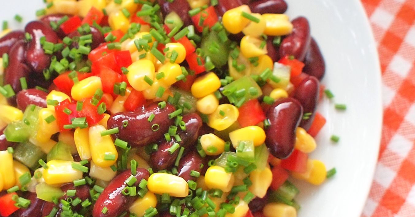 Fazole i kukuřici scedíme. Papriku očistíme, zbavíme jádřince a nasekáme na drobné kostičky.