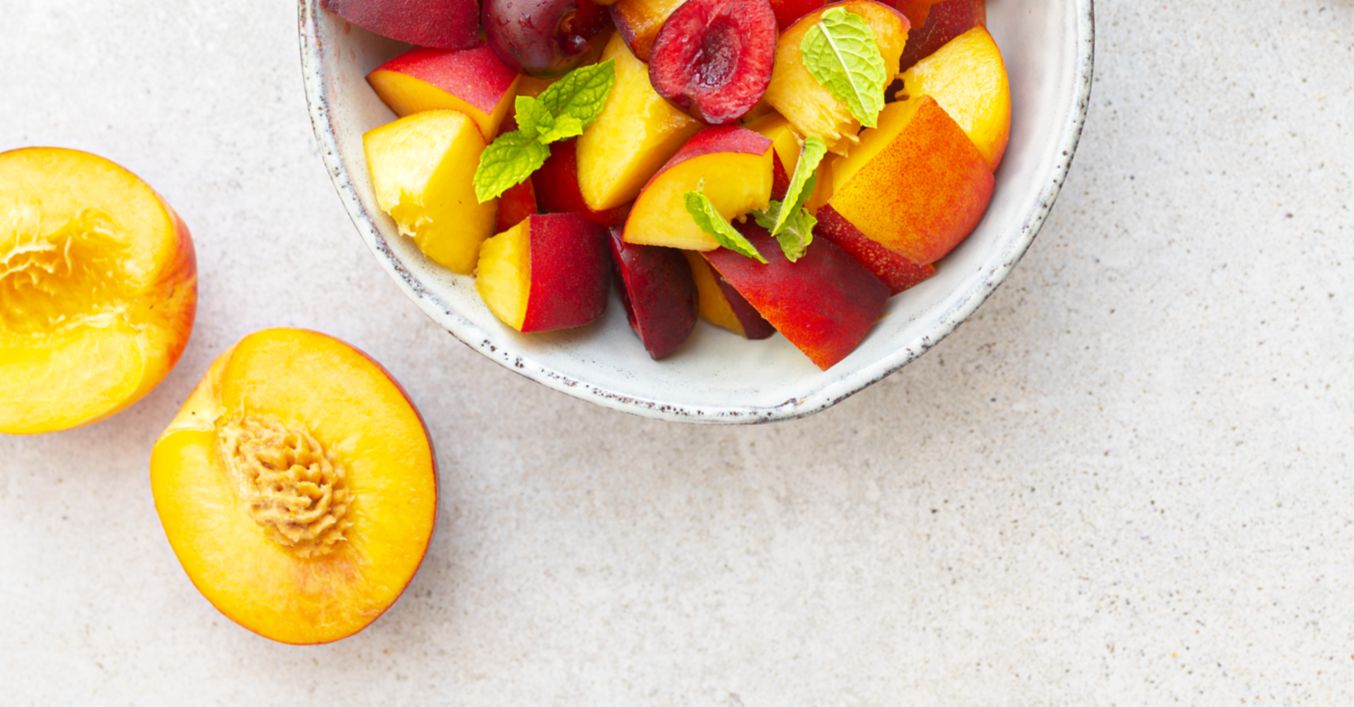 Broskev, nektarinku a třešně vypeckujte. Nakrájejte na kousky a promíchejte s citronovou šťávou. Podávejte s čerstvou mátou.