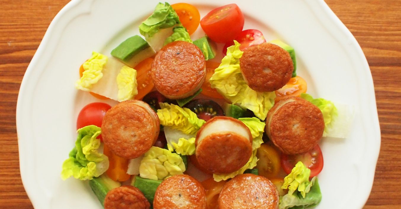 Klobásy nakrájíme na kolečka. Avokádo zbavíme pecky, oloupeme a nakrájíme na kostky. Rajčata očistíme a rozpůlíme. Salát rozebereme na listy, propereme, osušíme a natrháme na sousta.