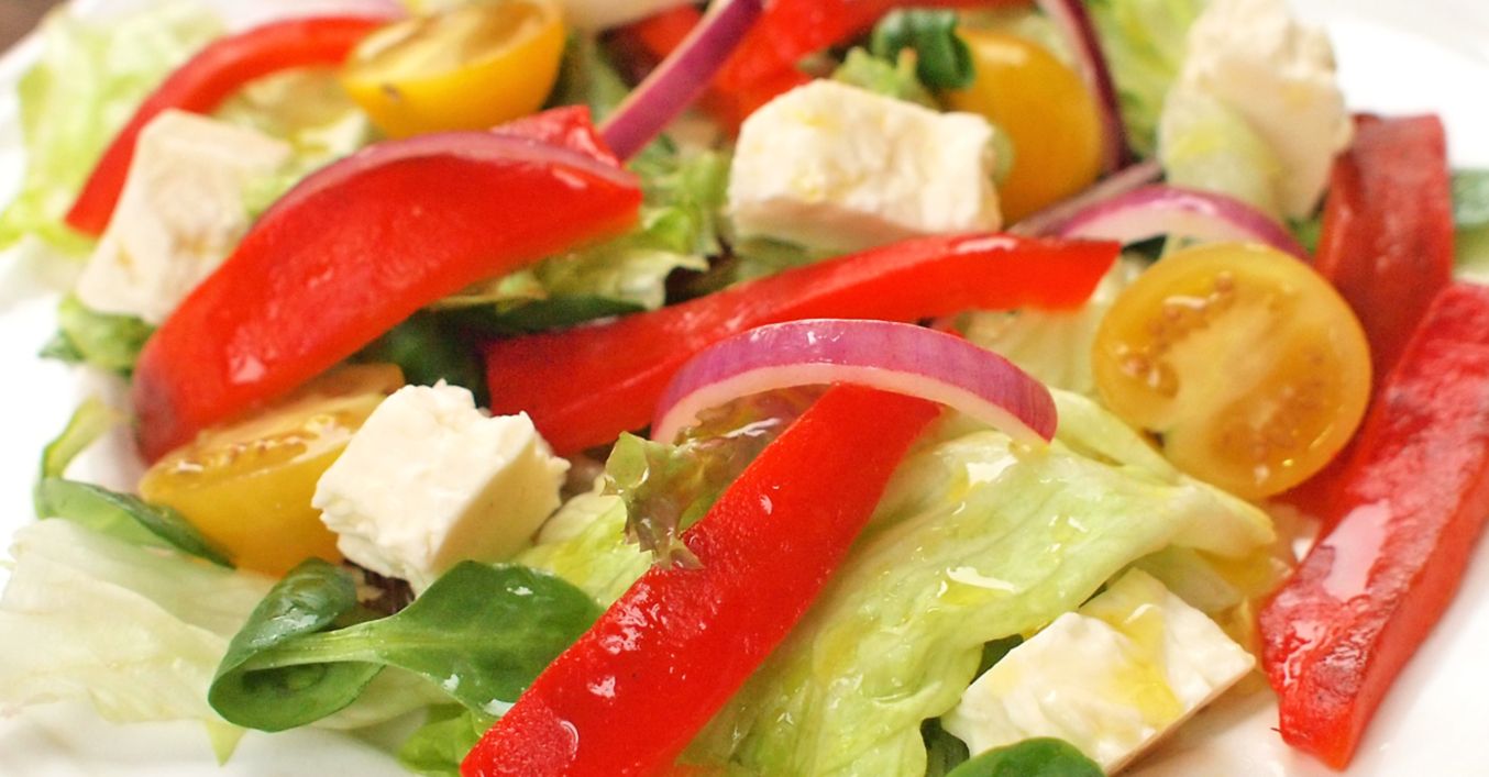 Salát, papriku, rajčata a cibuli uspořádáme do misek. Zakápneme zálivkou a posypeme rozdrobeným balkánským sýrem.