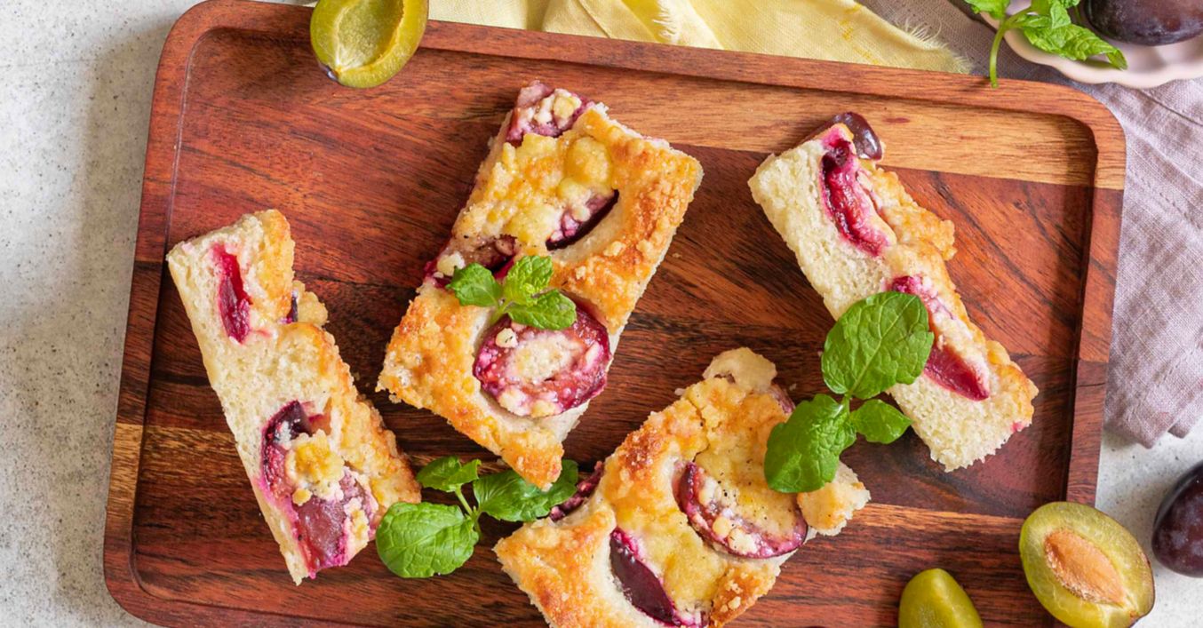 Těsto vlijte do vymazané a vysypané formy nebo plechu. Poklaďte švestkami a posypte drobenkou. Pečte 30 minut v troubě vyhřáté na 180 °C.