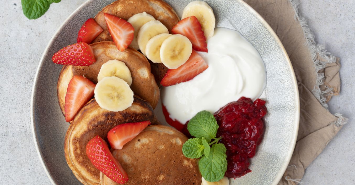 Lívance podávejte s jogurtem, jahodovou marmeládou, čerstvými jahodami, banánem a mátou.