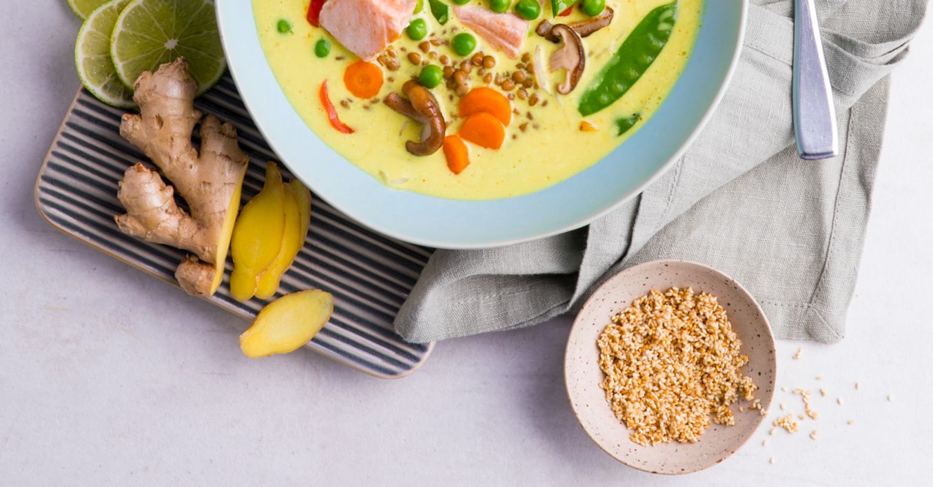 Zalijeme kokosovým mlékem a zeleninovým vývarem, přidáme lososa a na středním plameni dusíme 3 až 5 minut.
