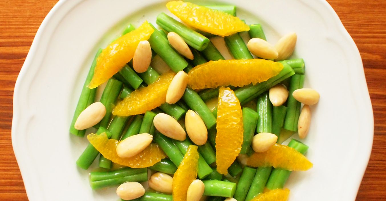 Pomeranče oloupeme nožem a nakrájíme na kolečka. Mandle opražíme nasucho na pánvi a nahrubo nasekáme. Připravené lusky rozdělíme na porce, přidáme pomeranče a ozdobíme mandlemi.
