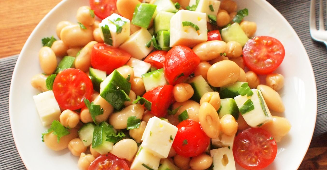 V míse smícháme luštěninu, zeleninu a sýr. Vmícháme bylinky a olivový olej. Dochutíme trochou citronové šťávy a uložíme do chladničky.