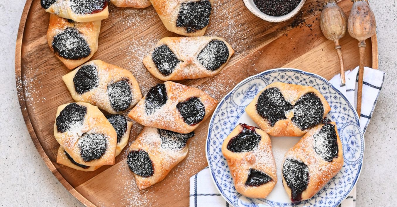 Do středu dejte lžičku makové náplně. Protilehlé okraje čtverečků spojte. Šátečky potřete rozšlehaným vejcem.