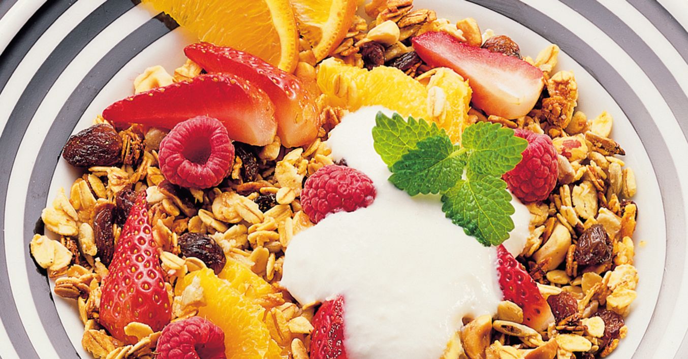 Do misek rozdělíme müsli, přidáme ovoce a zalijeme jogurtem.